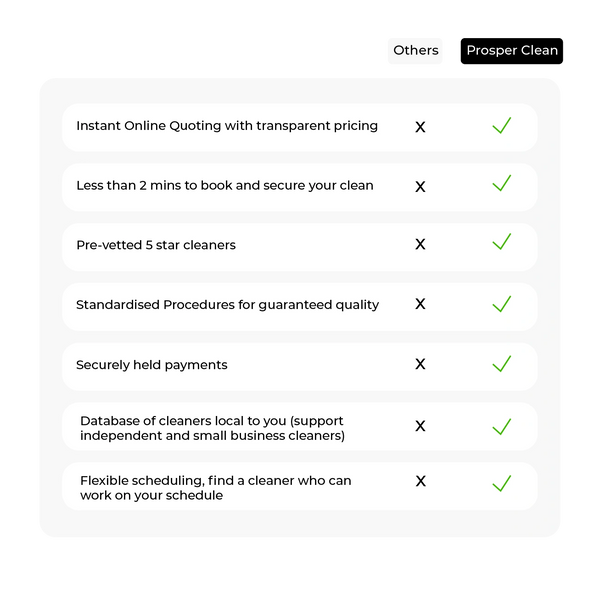 Prosper Clean has a database of 100s of cleaners all around Australia, so chances are there will be an A+ cleaner available in your area for requested date and time. If you are flexible on date and time you can share this info during the booking process as well. If for some reason your house clean is unable to be fulfilled the secure payment held will be returned to you in full.